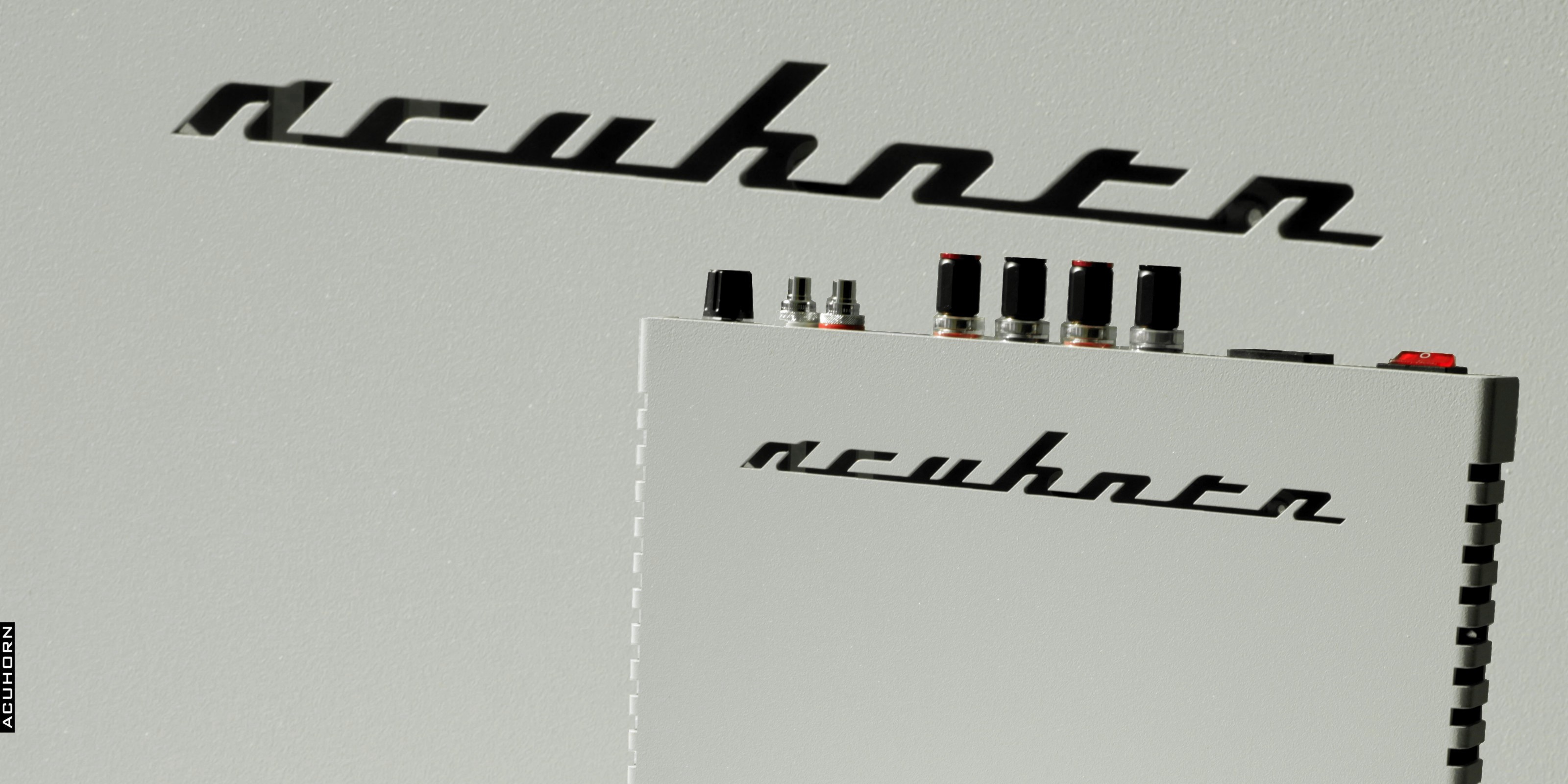 Acuhorn stereo 3 solid state amplifiers. Ultra high speed mosfet, Single ended, class A. Hi-tech architecture amplifier with Vicor modules DC-DC converters. Audio path solid core OCC copper.